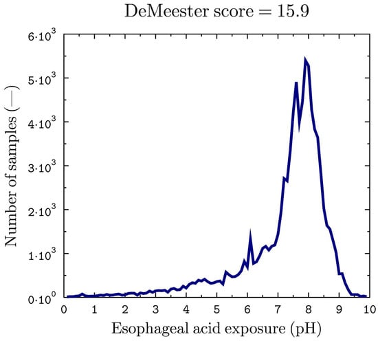 In the first step of the main calculation phase (for the data after the clearing from artefacts, resampling, and filtering processes), the 24-h pH time signal was processed by the determination of the distribution of the pH values in the assumed range (from zero to maximum value for each patient). Figure 3 shows the result of the signal processing in the cases of three selected patients.