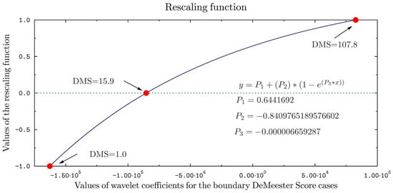 In order to more clearly differentiate the group of patients with diagnosed reflux from healthy patients, a transformation using a scaling function specially designed for this purpose was applied. The scaling function is shown in Figure 8. The parameters of the exponential scaling function were determined from the results of the calculations for the marginal cases of a healthy patient (DeMeester score = 0.8) and a patient with reflux (DeMeester score = 107.8). The patient case with a calculated DeMeester score equal to 15.9 was taken as the borderline between the sick and healthy cases.