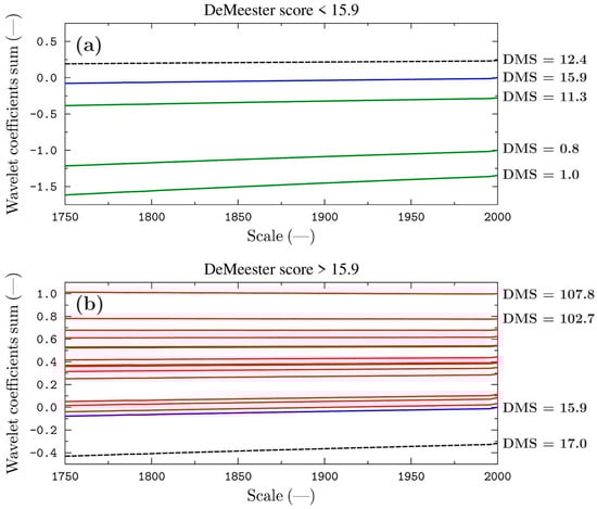 Curves representing rescaled sums of wavelet coefficients. Different colours indicate cases of calculated DeMeester score (DMS): (a) classification of healthy patient: blue line—baseline (DMS 15.9), green lines—healthy patient (DMS < 15.9), black dashed line—misclassified patients (DMS = 12.4); (b) classification of patients with reflux: blue line—baseline (DMS = 15.9), red lines—a patient diagnosed with GERD (DMS > 15.9), black dashed line—misclassified patients (DMS = 17.0).