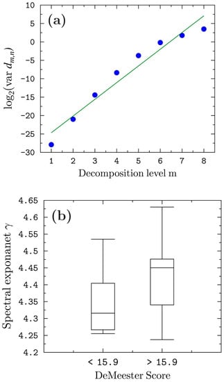The values of the gamma exponents, for 24-h measurements of acid exposure, were determined according to Equation (1) using the DWT method. The gamma exponent can be graphically interpreted as the slope angle of the trend line for the points obtained from the discrete wavelet transform of the signal under study (Figure 11a). Figure 11b additionally shows box plots based on the fractal dimension analysis, illustrating the similarities and differences between the healthy and sick patients.