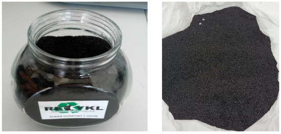 The case study company deals with the recovery and processing of waste into alternative fuels, RDFs (refuse-derived fuels) [37]. RDFs are created as a result of the transformation of waste the energy potential of which is sufficient to obtain energy or the properties of which allow it to be processed into products that can be used for energy. RDF is a specific type of fuel, characterized by high calorific value and homogeneous particle size. Its production consists in separating the combustible fraction (paper, plastics, textiles, wood, rubber) from municipal waste by sorting it and subjecting it to a multi-stage process of shredding followed by briquetting [38]. The production of alternative fuels is an excellent way to minimize the overall amount of waste and to obtain energy, the recipients of which in Poland are cement plants. Therefore, the examined plant is located in the Cement Plant Chełm. It specifically deals with the production of rubber granules using the material resulting from the recycling of the used car tires and other rubber components. A sample of the final product is presented in Figure 1.