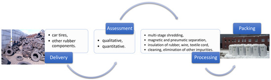 Waste is delivered to the indicated plant by trucks or vans. After entering the plant and undergoing a qualitative assessment, the waste in the form of tires is weighed using a truck scale and then it is directed to the unloading storage yard. The technological line for the processing of rubber waste consists of a pre-shredding section, proper grinding as well as magnetic and pneumatic separation. The technological line includes shredders, granulators, sets of special sieves, belt conveyors, mixers, and magnetic and pneumatic separators [37]. The preliminary shredding section includes machines and devices responsible for the initial shredding of waste into the 20–40 mm fractions (pre-shredders), then, in the proper shredding section, through the sets of granulators and specialized grinders, proper shredding takes place, resulting in the appropriate fractions of 0.01–30 mm granules, combined with simultaneously isolating rubber, wire and textile cord to separate devices for further processing [32]. The isolated raw materials are directed to the machine groups responsible for the production of final products. The shredded rubber is directed to mills and pneumatic separators in order to clean it and eliminate undesirable impurities. Then, it is packed in collective packaging. The steel wire is directed to magnetic separators and then to other grinding devices and a sieve classifier which cleans the wire of impurities. The cleaned wire (steel cord) is directed to the places of temporary storage in the storage yard [37].