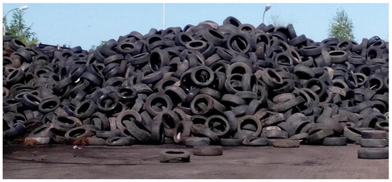 The company processes a total of approx. 47,000 tons of waste per year, including used tires as well as plastics and rubber. In connection to the functioning of the installation, the waste in the form of ferrous metals and alternative fuels is generated. Both types of finished products, i.e., rubber granulate and a stabilizing additive for mineral–asphalt mixes, are widely used in the manufacturing of products, e.g., car mats, slabs and rubber paving stones for playgrounds, etc. Tires are stored in special boxes outside (Figure 3).