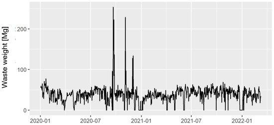 The works [43,44] underline that the effective planning of the supply process is the key importance in a company. For the presented company, the assessment of the probable level of supply in the production raw material (i.e., used tires) was analyzed. The company has many suppliers, which is why the tires come from many different sources, and due to the specificity of the assortment, it is often difficult to determine the expected weight of the delivery. The figure below, presenting the level of deliveries over almost three years (Figure 4), clearly shows how significantly they can vary.