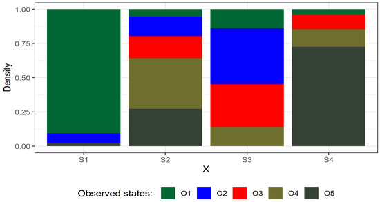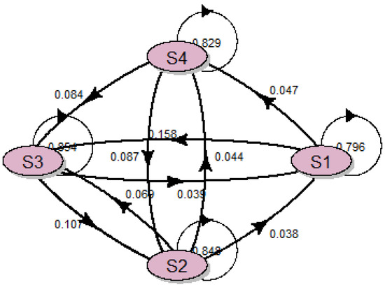 Next, the four hidden states describing the dynamics of the hidden part of the system and using the Markov model for this purpose were determined. In order to describe the dynamics of hidden states, the probability matrix of transitions between the states was determined. These values are presented in the graph showing the relationships between hidden states (Figure 5).