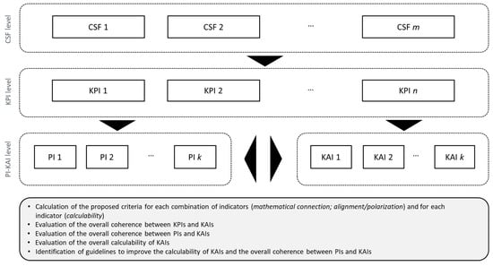 - Assessment of consistency and alignment to the industrial PMM hierarchy—It represents the crucial step of the entire methodology, which introduces three quantitative criteria for evaluation of the indicators’ alignment. When an alignment is less than satisfactory, a feedback loop is triggered, and the industrial PMM system design is continuously executed until the PMM system consistency is deemed acceptable.