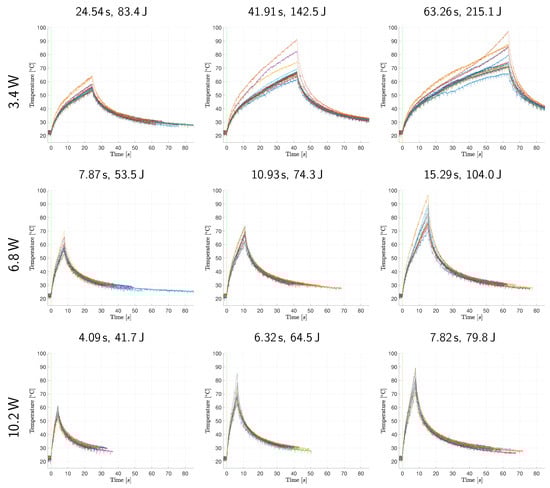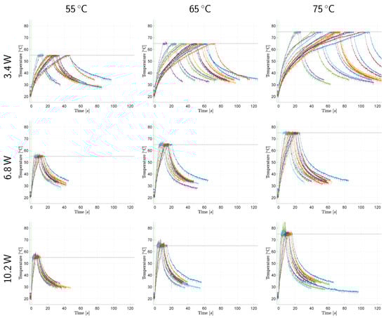 Temperature monitorization data of surface temperature controlled laser irradiation. The temperature–time response graphs (each individual sample represented with a different curve color) within each group are superimposed. The horizontal black lines and the vertical green lines represent the target temperature values and the laser emission commencement marks, respectively.