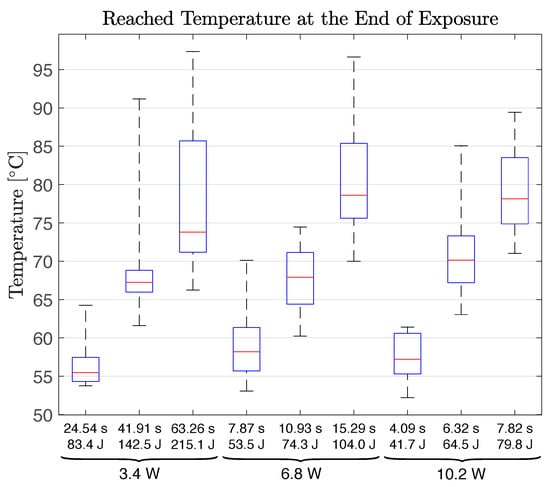 Descriptive temperature values for the fixed-dose application: The mean (), standard deviation (), range (), maximum () and minimum () values of the achieved tissue surface temperature at the end of laser exposure ().