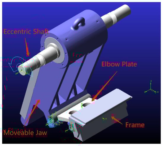 - Errors in the structural parameters of the virtual prototype. Adams is deficient in modeling capability, so a 3D model of the crusher is built in SOLIDWORKS and imported into Adams, while some structural simplifications are made to the model, such as merging the bearing rollers of the eccentric shaft and thickening the revolute joint where the elbow plate is connected to the moveable jaw, resulting in minor changes in mass, volume and other parameters.