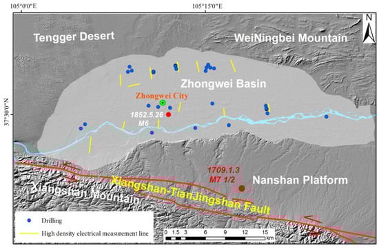 The Zhongwei Basin is located in the arc-shaped structural belt on the northeastern margin of the Tibetan Plateau, which is the product of strong tectonic movements and fluvial geology. As shown in Figure 1, The largest earthquake ever recorded was the 1709 Zhongwei 7½ Ms earthquake. According to historical records, this earthquake caused heavy disaster losses. The seismic structure of the 1709 Zhongwei 7½ Ms earthquake was the Xiangshan–Tianjingshan fault zone, which was less than 15 km away from the Zhongwei Basin. The Xiangshan–Tianjingshan fault is an active Holocene active fault that has a risk of earthquakes of 8.0 Ms in the future.