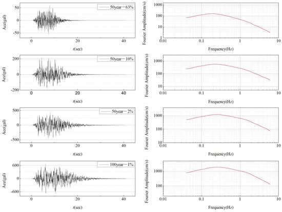 To maximize the reflection of the actual structure subjected to seismic action, site-specific ground motions are necessary. In this paper, artificial ground motions were generated by gradually approaching the target design spectrum in this area. Four ground motions with different amplitudes were generated based on the return period of this area, as shown in Figure 3. They corresponded to exceeding probabilities of 63% (frequently occurring earthquakes), 10% (normally occurring earthquakes), and 2% (rarely occurring earthquakes) in 50 years, and 1% in 100 years (extremely rarely occurring earthquakes).