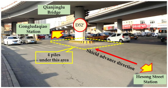 The project of shield machine cutting bridge piles in Harbin Metro Line 3 is located in interval between Hesong Street station and Gongludaqiao station, which is in the central area of Harbin city in China. According to the construction plan, the interval tunnel from Hesong Street station to Gongludaqiao station has to cut and pass through the reinforced concrete pile foundation of Qianjinlu Bridge, as shown in Figure 1.
