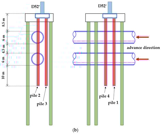 The relative position of tunnels and piles: (a) Top view; (b) Front view and side view.