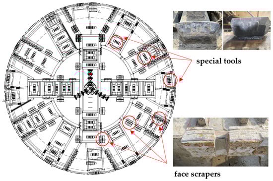 A slurry balance shield machine manufactured by CCCC Tianhe Machinery and Equipment Manufacturing Co., Ltd., Changshu city, China was used in tunneling. The shield machine with a cutter head diameter of 6270 mm is equipped with 60 modified shell-shaped tools (special tools) to efficiently cut reinforced concrete piles. The cutter head and cutter layout are shown in Figure 3.