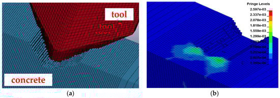 Appropriate model parameters are critical to the accuracy of cutting force calculations. Many scholars have fitted the parameters of the HJC model and given the results. The parameters of the HJC model below are determined based on the available static and modified according to laboratory dynamic test data [40]. The tool parameters are based on the special tools used in the field test and engineering practice case below. The blade width of the special tools in the model is 4 mm, the edge angle is 90 degrees, the rake angle is −45 degrees and the relief angle is 0 degrees. These are common parameter values for special tools (shell-shaped tools) used for cutting reinforced concrete piles. In consideration of computational efficiency and accuracy, the unit size ratio between the cutting area and other areas should be reasonably adjusted. The size of the concrete unit inside the cutting area is about 0.1 mm. The cutter model is set as a rigid body. The parameters of the HJC model are shown in Table 2. The diagram of model and an example of cutting process are shown in Figure 6.