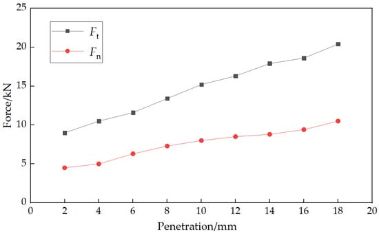 In order to facilitate the calculation of the following engineering cases in this paper, the cutting force with different penetration was obtained through this model. The results are shown in Figure 7. It can be seen that the relation between cutting force and penetration is nearly linear and the cutting force is also linearly related to the penetration.