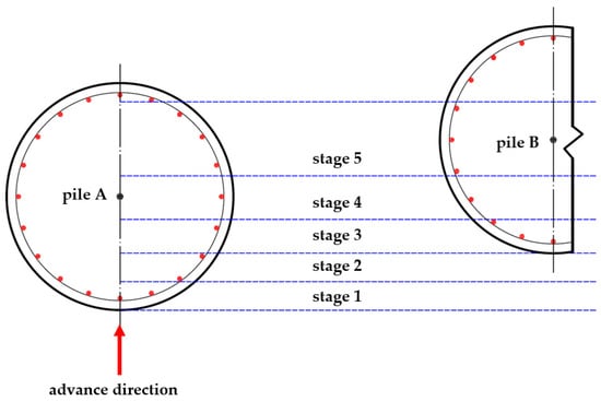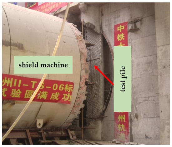 In order to observe and study the process of shield machine cutting reinforced concrete piles, a field test of cutting two piles was conducted earlier in Suzhou, China. Shield operational parameters, such as the total thrust force, the total torque, the cutter head rotation and the advance rate, were collected in the process of cutting. The data were processed and compared with the results from the calculation model to judge the accuracy of the calculation model. Considering the feasibility, safety and economy of the test, two test piles were cast in front of the tunnel portal as in Figure 8. The layout of the test piles is shown in Figure 9. The pile A is arranged at the centerline of the portal and the pile B pile is 1.8 m away from the axis of the tunnel. The longitudinal offset between the two piles was 0.3 m. Twenty main bars of φ 22 and HRB 335 were installed in each pile. The concrete strength is C30 and the thickness of concrete protective layer of piles is 50 mm. The top and bottom of the test piles were fixed by means of welding and planting bars, which can prevent the pile from moving back and forth during the cutting.
