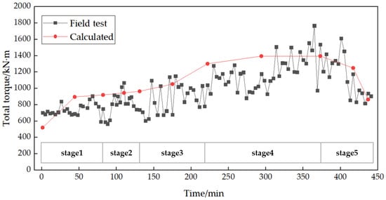 Before starting pile cutting, the thrust and torque of the shield machine in non-cutting pile state were tested. When the shield machine was advancing at a speed of 1~10 mm/min on the guide rail bracket, the total thrust was nearly steady at about 900 kN and the total torque was about 400 kN·m. The additional torque values of the cutter head at the starting position, midpoint position and end position of each stage were calculated and compared with field test results. Since in this test, the shield is in an open space and there is no influence of the surrounding ground environment, the total torque and total thrust of the cutter head can be obtained by adding the above two loads. In addition, penetration depth in the numerical model refers to the vertical depth from the blade edge to the cutting surface. In the field test, the penetration depth of the tools is not constant during the advance of the shield machine because the advance rate fluctuates continuously. Penetration in shield tunneling is usually calculated by dividing the advance rate by the rotation rate and it represents the advance distance of the shield machine within one revolution of the cutter head. It is a simplified approximate calculation of the true penetration of the tools and was widely used in engineering. The steadier the advance rate is, the closer the calculated penetration is to the real penetration depth of the tools. When performing model calculations, the penetration is calculated using the average advance rate for a period of time around the calculation cross-section. Calculated total torques are compared with field test results. As shown in Figure 11, the field test torque fluctuates obviously as the shield machine continues to advance. In the first and second stages, the torque increases slightly. At these two stages, the cutter head only cuts pile A and has not touched pile B. From the third stage, the torque began to increase significantly. The main reason is that the cutting condition has changed from cutting one pile to cutting two piles at the same time, which means more shield tools are involved in cutting piles. In the fourth stage and the early stage of the fifth stage, the shield torque has been at a high value of about 1300 kN·m and the cutting surface width of the two piles is close to the diameter of the piles. The field test torque reached a peak of 1768 kN·m at the end of the fourth stage and the calculated result also reached a peak of 1396 kN·m at the same position. Subsequently, at the end of the fifth stage, the cutting force of the cutter head decreased rapidly and the top of pile A was broken. Despite there being certain differences between the field test dates and the calculated results, overall, the calculated torque is roughly consistent with the field test data. To some extent, this verifies that the additional torque by calculation model is reasonable.