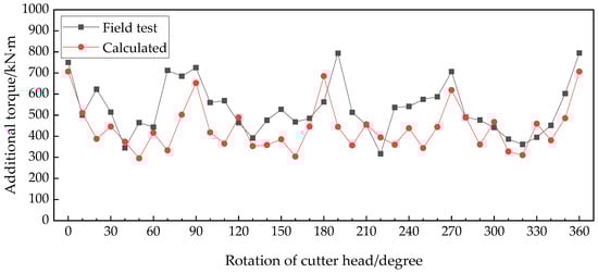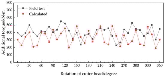 Figure 12 shows additional torque at different rotation angles of cutter head when cutting through pile No. 1. It can be seen from the figure that both the field test additional torque and calculated results fluctuate obviously with the rotation of cutter head. The field test additional torque varies in a range from 240 kN·m to 533 kN·m, with an average value of 331 kN·m. The calculated result varies in a range from 191 kN·m to 486 kN·m, with an average value of 404 kN·m. A main reason for the fluctuation of additional torque is the number of tools that are in contact with the pile. Besides, the state of contact between the cutter head and pile is complicated and uncertain in excavation process, which can cause some data errors as well. Overall, the calculated additional torque is roughly consistent with the field test data in construction. To some extent, this verifies that the prediction of the additional torque by the calculation model is reasonable.