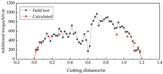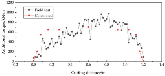 Additional torque at different cutting distances when cutting through pile No. 1 and pile No. 2 are shown in Figure 14 and Figure 15, respectively. As can be seen, with the increase of cutting distance, the additional torque presents a trend of first increasing and then decreasing. The main reason is the change of the cutting area and the number of tools that are in contact with the pile. According to the calculated results, the additional torque reaches the maximum value when the cutting distance reaches the radius of pile. This agrees with the conventional mechanical analysis. Field test additional torque in Figure 14 decreases significantly when the cutting distance is half the diameter of the pile and then increases rapidly. This is caused by the operator’s active adjustment of the shield tunneling state. In actual excavation process, the shield advance rate and the thrust decreased when cutting to this position. Then, the shield operator actively increased the thrust to ensure shield advancing. As the advance rate increased, the penetration of the cutter became larger, causing the rise of tools’ cutting force and the total torque of the cutter head. This suggests that it is important to maintain proper thrust and lower advance rate during cutting pile process to avoid excessive cutter head torque. The additional torque predicted by the calculation model is in agreement with the field test results.