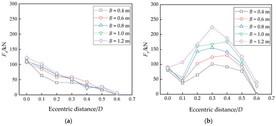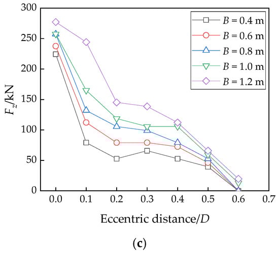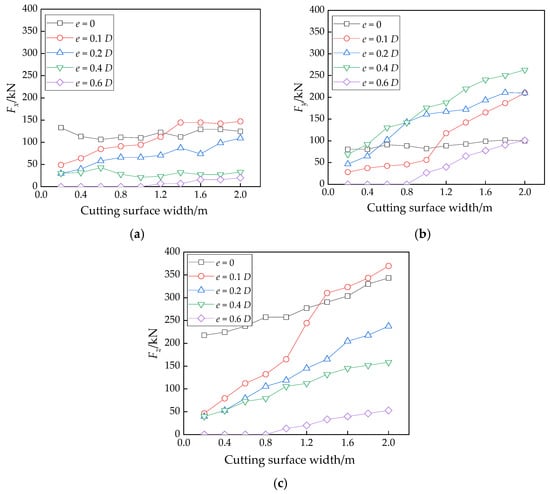 Figure 16 illustrates the relations between interaction forces Fx, Fy, Fz and cutting surface width B under different eccentric distances of 0, 0.1 D, 0.2 D, 0.4 D and 0.6 D, where D = 6 m is the diameter of the shield machine. It can be observed that with the increase of the cutting surface width, the interaction forces Fx, Fy and Fz show an overall increasing trend with slight decreases in some ranges. The main reason is the increase of the number of tools. The interaction force Fz is much greater than Fx and Fy, and increases significantly. Especially when the cutting surface width exceeds 1.0 m, the gap is more obvious. A possible reason is that when the pile foundation width is large, the tools at the opposite sides of the cutter head (upper side and lower side) have opposite cutting directions (in the X direction) and they partly cancel out cutting force of each other, while cutting forces in the Y direction were added to each other and penetrate forces in the Z direction have the same signs as well.