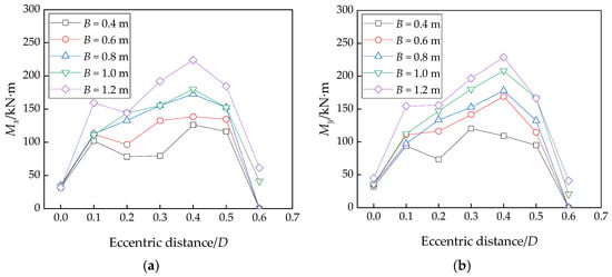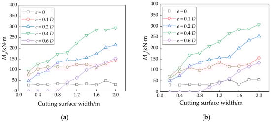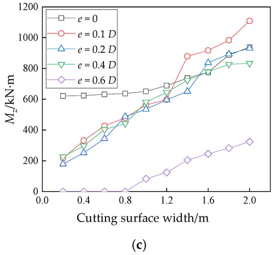 The relations between the moments Mx, My, Mz and cutting surface width B under different eccentric distances are shown in Figure 17. In a similar way as the interaction force, the moments increase with the width of the cutting surface, and the moment Mz increases more significantly. Mz, which can be considered as the additional torque of the shield cutter head, is also much greater than Mx and My, which are considered unbalanced moments. Therefore, it can be inferred that the adequate torque for the shield machine is required to ensure that the shield can cut piles and pass through quickly.