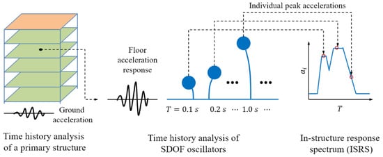 Step (4) Coupled analysis using the two-DOF model: Coupled analysis of the two-DOF system is performed using Equation (18) in the frequency domain. The absolute acceleration of the equipment is calculated using Equation (20). Then, the absolute acceleration of the equipment is transformed into the time domain by inverse Fourier transform and the peak absolute acceleration is determined.