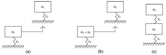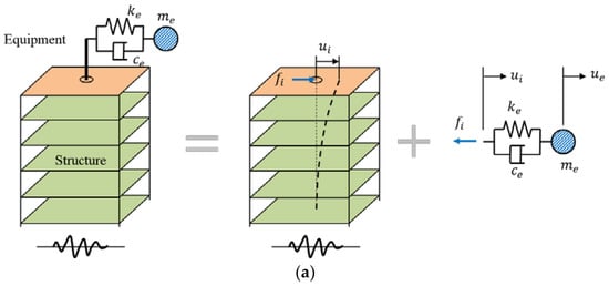 The equations of motion for a structure coupled with equipment are formulated assuming that the primary system is an MDOF structure, and the equipment is represented by an SDOF oscillator, as shown in Figure 2a. The equations of motion for the equipment and structure are expressed by Equations (1) and (2), respectively, as follows: