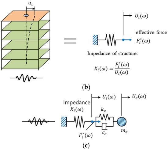 Equation (17) represents the condition in which the effective force acts on the two-DOF system illustrated in Figure 2b, where the main structure is replaced by the impedance represented by Equation (15). The impedance and displacement used to compute are not dependent on the characteristics of the equipment, as those variables are determined from the equation of motion for the structure itself and its response. Therefore, repeated analyses of the two-DOF system shown in Figure 2b, changing the stiffness of the equipment, allows for the efficient calculation of ISRS considering the equipment–structure interaction effect without repeated analysis of the MDOF coupled model with full DOFs.