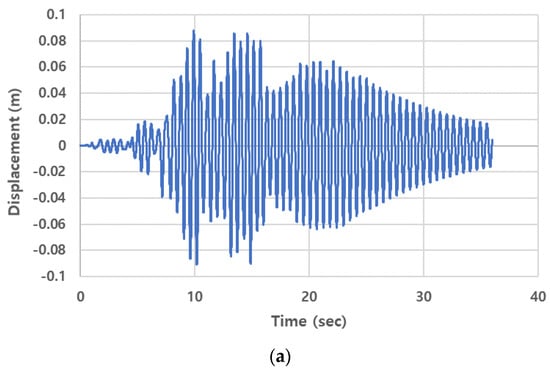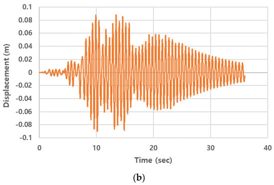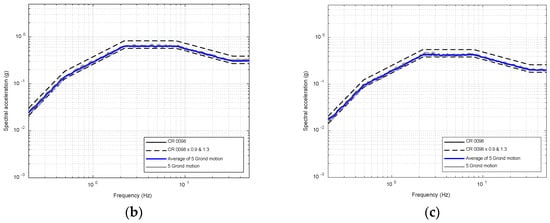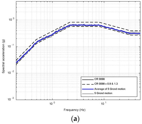 Spectral matching of the recorded ground motions was performed on the target response spectrum. Seed ground motions were selected from a total of 89 sets available from the list of ground motions that are appropriate for matching a rock site with the characteristics of the central and eastern United States (CEUS) presented in NUREG/CR-6728. The selected ground motion sets were matched to the target spectrum, and the five sets with the least change in the waveform were selected. See Jeon et al. (2022) for the detailed selection process [34]. The selected ground motions are listed in Table 3. The mean response spectrum of the five matched ground motions in each direction so that it is between the upper and lower bound defined by 1.3 and 0.9 times the target response spectrum, respectively, as shown in Figure 5 [35].