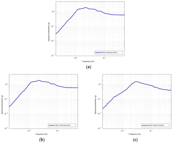 Mean response spectra of the surface ground motions obtained from site response analysis: (a) H1; (b) H2; (c) V.