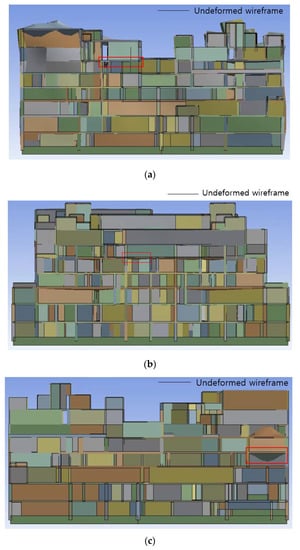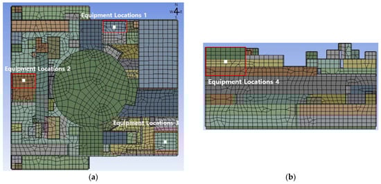 Figure 16 shows mode shapes corresponding to the dominant frequencies in the V-direction decoupled ISRS for equipment locations 1 to 3. As illustrated in Figure 16a, the dominant mode shape for vertical vibration at equipment location 1 is not as prominent as other parts, and major vertical deformation occurs on the roof and other slabs. In the case of equipment location 2, the local vertical deformation at the location is not prominent compared to other parts too, and the vertical deformation appears to be dispersed in most slabs.
