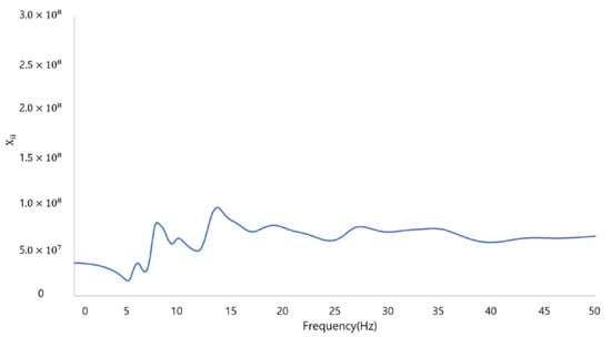 Both decoupled ISRS that does not consider the equipment–structure interaction and coupled ISRS that considers the equipment–structure interaction were calculated and compared at the selected equipment locations. The decoupled ISRS was calculated based on the response acceleration at each equipment location, which was obtained from the response analysis of the auxiliary building decoupled from the equipment represented by Equation (7) using ANSYS. The coupled ISRS was calculated directly as the acceleration response of the coupled two-DOF model represented by Equation (18) using the MATLAB code. For this procedure, the mechanical impedance expressed by Equation (15) was calculated as the inverse of the complex displacement response at the equipment location to the complex harmonic force with unit amplitude at the same node using ANSYS. The mechanical impedance at equipment location 1 in the H1 direction is plotted in Figure 8. It is noted that all ISRS in this study were calculated at frequencies from 0 to 20 Hz with an increment of 0.01 Hz. The equipment frequency was varied by changing the equipment stiffness keeping the equipment mass constant. The mechanical impedance of the primary structure was calculated up to 50 Hz, which is higher than the Nyquist frequency of the 20 Hz oscillator, with an increment of 0.1 Hz.