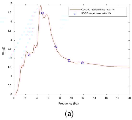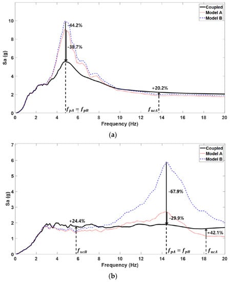 First, the equipment locations and frequencies for applying the decoupling criteria were selected as the frequency at which the response difference between the decoupled and coupled analyses was significant, as shown in Figure 12, Figure 13, Figure 14 and Figure 15. Essentially, the frequency at the peak of the decoupled ISRS was selected for the following conditions: H2-directional ISRS at equipment location 1, V-directional ISRS at equipment location 2, V-directional ISRS at equipment location 3, of which total mass ratio are 1, 0.1, and 0.001%, respectively. The selected equipment frequencies and corresponding response reduction rates are shown in Figure 20, where and represent the frequency at the peak of ISRS using Models A and B, respectively. In addition, and represent the frequency where the coupled ISRS yielded an unconservative response compared to uncoupled ISRS using Models A and B, respectively, and located in a relatively flat part of the ISRS. The peaks of uncoupled ISRS at and decreased by 29.8–65.3% using the coupled analysis. Meanwhile, the spectral accelerations of uncoupled ISRS at and increased by 20.2–42.1% using the coupled analysis. In other words, the selected conditions include both conservatism and non-conservatism that can exist in the coupled analysis.