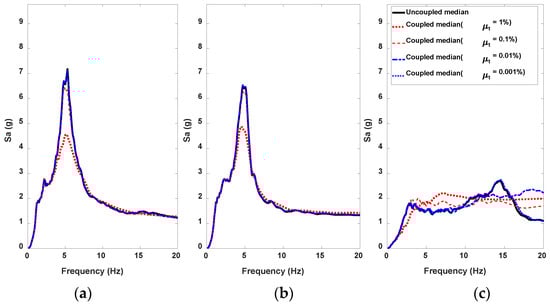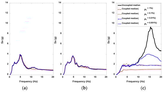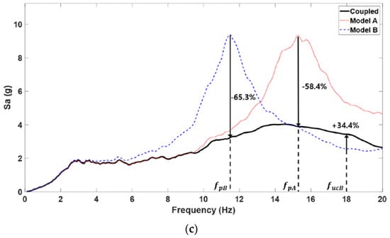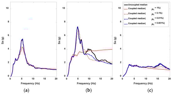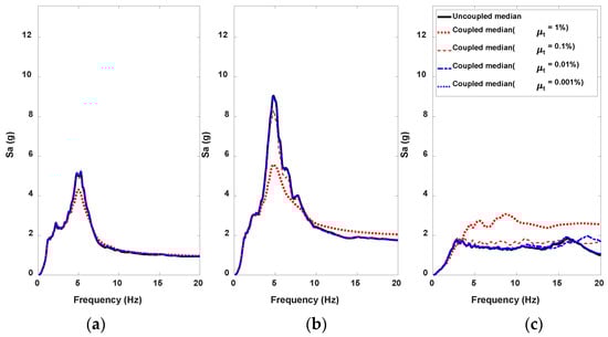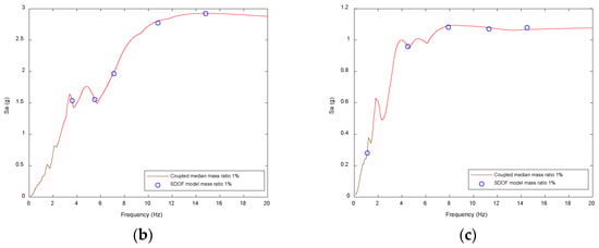 For the selected frequencies in Figure 20, combinations of the frequency ratio and modal mass ratio are plotted with the decoupling criteria expressed by Equations (27) and (29) in Figure 21, where , , and are marked in the corresponding figure in Figure 20. All 1783 vibration modes of the auxiliary building structure with a natural frequency from 3.4 to 75.9 Hz calculated in the eigenvalue analysis were included to plot Figure 20. However, in Figure 21c, the mass ratio was limited to those higher than to concentrate on major modes with relatively higher mass ratios. Except for equipment frequencies and in Figure 21b, all points are located inside the region U, where coupled analysis is not required. However, as shown in Figure 20, the response obtained by the coupled analysis is significantly different from that of the decoupled analysis using Models A or B. In particular, the spectral acceleration at a number of selected equipment frequencies obtained by coupled analysis was 20–42% higher than that obtained by decoupled analysis using Models A or B.
