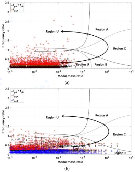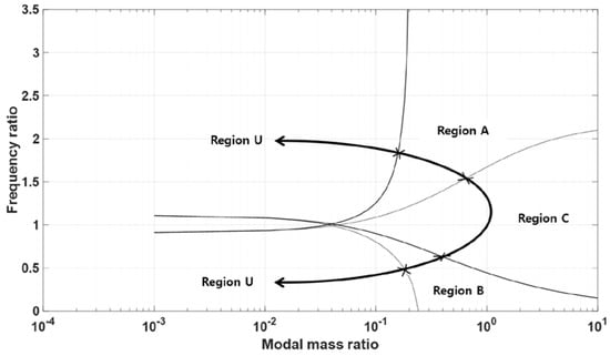 and is the natural frequencies of the equipment; is the natural frequency of the decoupled structure in Model A; is the modal mass ratio calculated for the modal mass of Model A; is the acceptable error in the natural frequency predicted by Model A compared to that calculated by the coupled Model C. The dashed boundaries between regions U and B and between regions A and C in Figure 18 are expressed by the following equation [37]: