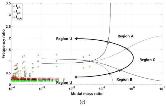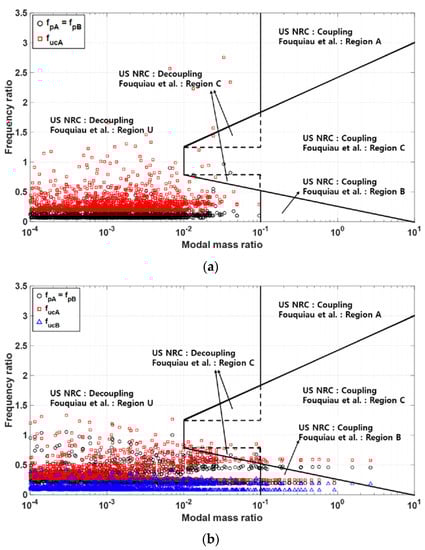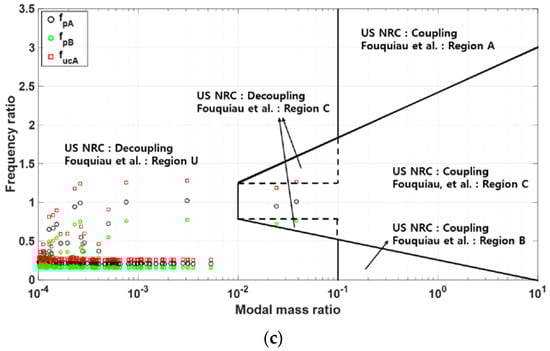 Two additional decoupling criteria by US NRC and Fouquiau et al. were applied to the same combinations of the frequency ratio and modal mass ratio mentioned above and the results are plotted in Figure 22. Most selected equipment frequencies denoted by and in each figure are related to one or more modes of which frequency ratio and modal mass ratio are located inside regions requiring coupled analysis by both US NRC and Fouquiau et al. criteria. However, for the equipment frequency in Figure 22c, all points are outside the coupling-required region of the US NRC criteria, but two of those points are inside Region C of Fouquiau et al. criteria. Therefore, Fouquiau et al. criteria can distinguish coupling-required equipment conditions the most adequately among the three criteria in comparison. It is notable that US NRC criteria are sufficient to distinguish equipment conditions for which decoupled analysis yields unconservative results such as equipment frequency and in Figure 22a–c although the accuracy of the equipment response can be significantly improved by coupled analysis as shown in Figure 20. Finally, in the case of in Figure 22b, it is observed that only one point is located inside Region C but many points are located inside the coupling-required area of US NRC criteria. Therefore, for robust decision-making, a combination of US NRC and Fouquiau et al. criteria marked with thicker solid lines in Figure 19 is recommended to define a region where explicit coupled analysis is required.