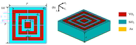 The metamaterial perfect absorbers are widely used in THz applications [17,18,19,20,21], especially a variety of tunable metamaterial perfect absorbers based on liquid crystals, graphene, semiconductors, and phase-change materials have been shown to obtain excellent reconfigurable properties [22,23,24,25,26,27,28,29,30,31,32,33,34,35,36,37,38]. Among these materials, the phase-change material of VO2 has the advantage of rapid modulation characteristics, which can achieve great transformation of conductivity at 340 K [39]. Using this characteristic of VO2, researchers have developed broadband or even dual-band adjustable absorbers. In 2020, Jiao et al. reported a tunable dual broadband terahertz absorber based on the VO2 structure with two groups of symmetric elliptical hollow structures, and its two bandwidths of 90% absorption were 2.32 THz and 2.03 THz, respectively. In 2020, Huang et al. proposed a metal–dielectric-phase material tunable broadband absorber, whose top structure was made up of four identical VO2 rectangle rings, and the absorption bandwidth reached 2.45 THz. In 2022, Yang et al. presented a broadband terahertz absorber based on a classical three-layer structure, with the absorption bandwidth up to 3.78 THz. However, although some metamaterial perfect absorbers based on VO2 have shown broadband absorption characteristics in recent years, their bandwidth and adjustable range still need to be further expanded.