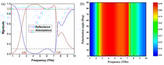 Firstly, the Figure 2a exhibits the best absorption state of the absorber when the conductivity of VO2 is 2 × 105 S/m. It can be seen from the result that under the condition of vertical incidence, the bandwidth greater than 90% absorption efficiency is as high as 4.26 THz and the frequency covers 3.01 THz to 7.27 THz. To verify the effect of polarization on the incident electromagnetic wave, the absorptivity under different polarization angles is simulated in Figure 2b. The absorption performance of the absorber remains consistent and confirms that the absorber is hardly affected by the polarization angle.
