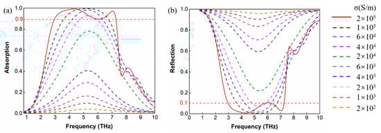 (a) Absorption spectrum and (b) reflection spectrum of absorber under different conductivities of VO2.
