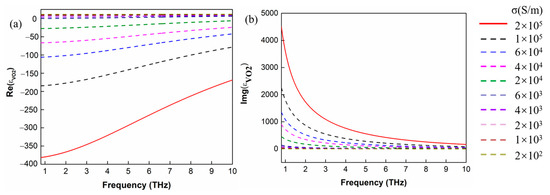 Next, the absorption and reflection spectrum can change dynamically accordingly to the conductivity variety of VO2. In Figure 3, when the conductivities of VO2 change from 200 S/m to 2 × 105 S/m, the absorption and reflection rate varies between 4% and 100%. At this time, the central frequency of the spectrum remains almost invariant at 5.17 THz, but the absorption peak has changed from the single absorption peak to double absorption peaks, with the increasing absorption bandwidth. The variety of the dielectric constant of VO2, which affects the overall absorption efficiency with the change of conductivities, can be taken into consideration to explain this phenomenon. It can be seen from Figure 4 that the imaginary part of the dielectric constant is much greater than the real part, which is the main factor of the absorption effect. With the increase in the conductivities, the imaginary part arises rapidly, thereby improving the overall absorption efficiency of the absorber. The results show that when the conductivities of VO2 are actively controlled by temperature, the absorber has tunable absorption characteristics. In addition, the properties of VO2 can also be adjusted by electricity [43] or heat [39] to realize the dynamic tuning of the working bandwidth and absorption efficiency.