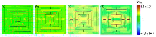 Electric field distribution at the center frequency of 5.17 THz when the conductivity of VO2 is (a) 2 × 102 S/m, (b) 2 × 103 S/m, (c) 2 × 104 S/m, and (d) 2 × 105 S/m.
