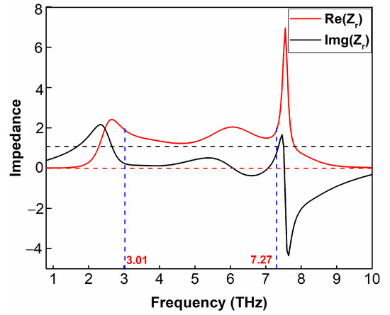 The S11 and S21 are the reflection and transmission coefficient of the S-parameter, respectively. When Z is equal to Z0, the surface reflection of the absorber reaches zero, indicating the attainment of the impedance matching. The figure reveals that the real part and imaginary part of the relative impedance are approximate to 1 and zero from 3.01 THz to 7.27 THz, explaining that the impedance between the absorber and free space is almost consistent, which conforms to the perfect absorption mechanism. Thus, the perfect absorption mechanism can be well illuminated through the impedance-matching theory.