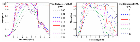 It is also important to analyze the effect of the geometric structure of the designed absorber on the absorption spectrum from optimizing the key parameters. Here, the VO2 and SiO2 with different thicknesses are applied to sweep the parameters of the top and middle layers in Figure 7. In Figure 7a, the absorption intensity first arises along with the addition of the top layer thickness, and then decreases with the further increase beyond the optimal value. Obviously, the absorption of the absorber is easily affected by the thickness of VO2. The coupling effect of VO2 with the bottom metal is very weak when its thickness is very thin. However, when its thickness turns thick enough, it exhibits a strong reflection effect, which is not conducive to matching the impedance of the vacuum. The optimal thickness of VO2 is 0.2 μm, and the broadband absorption range over than 90% absorptivity varies from 3.01 THz to 7.27 THz. In addition, the absorption spectrum affected by the dielectric thickness is also discussed in Figure 7b. Firstly, the central frequency of the spectrum is 5.17 THz, corresponding to the free space wavelength of 58 µm. Next, the refractive index of SiO2 is n = 1.95 (3.80.5), so that the corresponding central wavelength equals 29 µm in the dielectric layer. Here, the optimal thickness of the middle layer is 7 µm, which is almost equivalent to one fourth of the central frequency, and meets the interference cancellation effect between the reflected waves and incident waves. Thus, the perfect absorption mechanism can also be explained by the wave-interference cancellation theory. As a result, it is meaningful to study the thickness of VO2 and SiO2 for their improvements to the absorption performance.