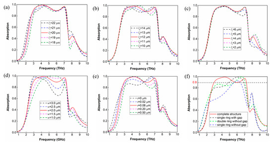 Figure 8 presents the absorption performance of the different geometric parameters of VO2. The different ring lengths will affect the coupling between the rings, so the optimal ring sizes l1, l2, and l3 can be obtained by scanning different sizes. As a result, the optimal structure parameters include l1 = 20 μm, l2 = 12 μm, l3 = 4 μm, w = 2 μm, and t = 0.08 μm. In Figure 8d, when the ring width increases, the number of absorption peaks in the absorption spectrum will change from one to two and the overall absorption bandwidth will also change greatly. Similarly, the gap width t on the rings will affect the overall absorption bandwidth and efficiency significantly, as in Figure 8e. The value t = 0.08 μm is the most ideal result of the gap width in the proposed design. It is worth noting that the complete structure shows greater absorption bandwidth and efficiency than a single ring with and without a gap, indicating that the integration of different structures adds to the resonance absorption of different frequencies, as in Figure 8f. Moreover, the increase in the number of rings helps to improve the overall absorption bandwidth and efficiency because the absorption performance of double rings is better than a single ring (Figure 8f). The optimal number of rings can be obtained by simulating the absorption efficiency of the multi-ring structure.