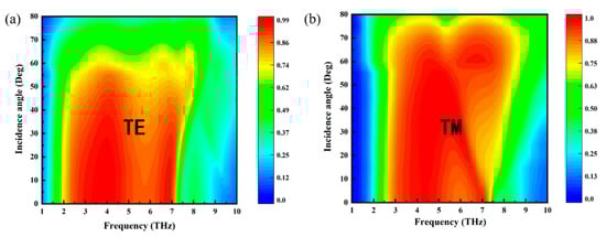 Finally, the above discussions mainly focus on the case of vertical incidence; thus, the influence of oblique incidence on the absorption will be further illuminated in this part. To analyze whether the absorber possesses a good absorption performance or not under oblique incidence, the absorption effect at different angles is simulated through the full wave simulation in Figure 9, including transverse electric polarization (TE) and transverse magnetic polarization (TM). Figure 9a shows that for the TE polarized waves, the absorption spectrum will not change at small angles (up to 55°), and its absorptivity will remain above 75% between 3.01 THz and 7.27 THz. For the TM polarized waves in Figure 9b, the main absorption peak in the spectrum narrows slightly along with increasing the incident angles. The absorption bandwidth narrows and higher-order modes appear as the incident angle reaches 25°. At the same time, the ratio of the wavelength (58 μm, 5.17 THz) and period (24 μm) is 2.42, which cannot meet the demand of the sub-wavelength scale for large angle incidence, so it tends to have some grating lobes and high-order diffraction. Thus, the above results show that the absorber works well at small incident angles.