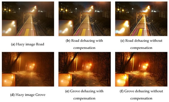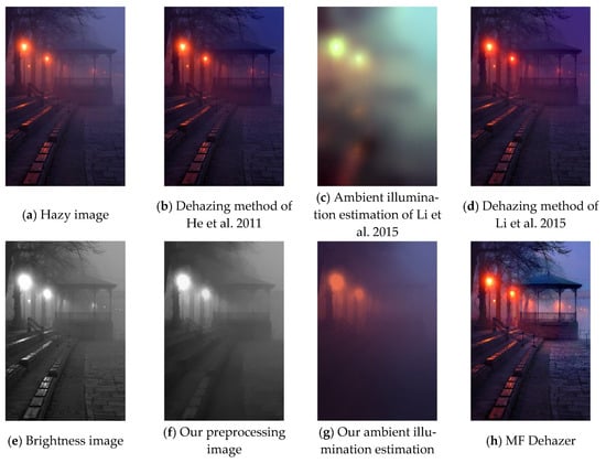 Figure 2 shows the comparison of different ambient illumination estimation methods and dehazing effects. He et al.’s [9] method chooses the brightest pixels in the image as the fixed value of the ambient illumination, which is affected by nighttime artificial light sources. If the brightness of the artificial light source is used as the ambient illumination, the light estimation will be higher. As a result, the color of the dehazing image in Figure 2b is too dark, which verifies that the ambient illumination estimation for nighttime dehazing should be a local variable rather than a fixed value. Because of the occlusion, the nighttime ambient illumination is directional and not scattered around. At the same time, the illumination intensity will decrease sharply due to the increase in distance and reflection. Therefore, the reflected light and the distant light source as a low light source should reduce the impact of illuminance estimation. It can be seen from Figure 2a,e that this image light is mainly two red light sources and presents umbrella-shaped illumination on the upper left. The ambient illumination estimation method of Li et al. [26] changes the color of the original light source, and because of its inability to preserve the edge, the light erodes to the backlight side. In comparison, we use the preprocessing image obtained by sub-window filtering as the guide image for ambient illumination estimation. The proposed method retains these two characteristics, and the color after dehazing is closer to the original color.