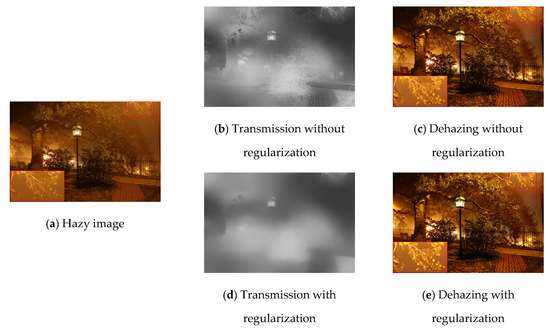 After the optimized transmission is obtained by the least square method, the dehazing image can be obtained using (3). As shown in Figure 4, regularization can effectively improve the structure of image details.