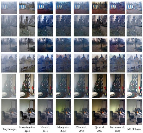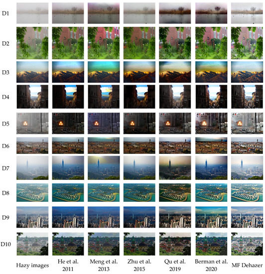 We chose the different prior methods of He et al. [9], Meng et al. [14], and Zhu et al. [12], the dehazing method based on deep learning of Qu et al. [21] and the recent dehazing methods of Berman et al. [15] to carry out daytime dehazing experiments. When using He et al.’s [9] method, it is easy to overestimate the illumination, causing the image to be too dark (Figure 6D5), and one side is dark when there are far and near scenes (Figure 6D4,D8). Zhu et al.’s [12] method also has the same problem. Meng et al.’s [14] method does not handle the sky area well and produces noise (Figure 6D1,D6,D10) and color artifacts (Figure 6D7). Qu et al.’s [21] method in some areas of complex pictures, such as trees, deepens the color of the image and causes the details to be unrecognizable (Figure 6D7,D9,D10). Berman et al.’s [15] method produces color artifacts at the junction of the sky area. For example, the sky at the junction with the mountain turns yellow (Figure 6D3) or green (Figure 6D9) as it is affected by the color of the mountain. By contrast, MF Dehazer does not have these defects. The sky, lake and the near and far scenes are handled more naturally; the color is closer to the original image, and it looks visually pleasing.