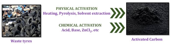 This paper is structured as follows. Firstly, the different activation methods for the production of AC are presented in Section 2. This is followed by a discussion on the different types of AC that can be generated, along with their properties and potential applications in Section 3. Section 4 presents the factors affecting the performance of AC in terms of its ability to remove various types of contaminants. This is followed in Section 5 by a detailed review of various applications of AC derived from waste tyres, with a focus on its application in the removal of various contaminants from wastewater. Section 6 finally presents the conclusions drawn from this study and directions for future studies.